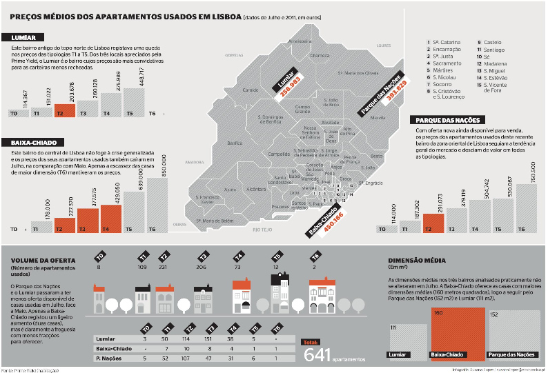 A Prime Yield, com base nos dados do Portal de Research da Casa Sapo, apresenta os valores médios dos apartamentos usados nas várias zonas de Lisboa, infografia esta desenvolvida pelo Diário Económico.