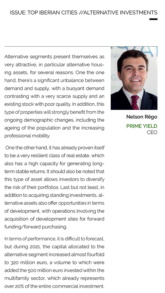 Questionado pela Iberian Property sobre “Porquê investir em ativos alternativos”, Nelson Rêgo, CEO da Prime Yield, salientou que este tipo de segmentos “são muito atrativos, em particular na área residencial”. Os bons fundamentais operacionais como o desequilíbrio entre a procura e a oferta e as alterações demográficas em curso são algumas das razões apontadas por Nelson Rêgo. Mas também, os retornos estáveis a longo prazo e a resiliência.