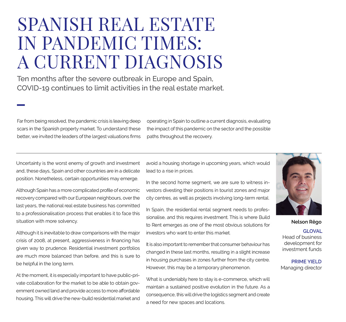 Nelson Rêgo, CEO da Prime Yield, foi um dos líderes das maiores empresas de avaliação a operar em Espanha convidado pela revista Iberian Property para fazer um diagnóstico sobre o impacto da pandemia no mercado imobiliário espanhol. Nelson salientou a incerteza que grassa no mercado, mas afirmou que várias oportunidades podem surgir mesmo neste contexto. Veja o artigo completo publicado na Iberian Property.