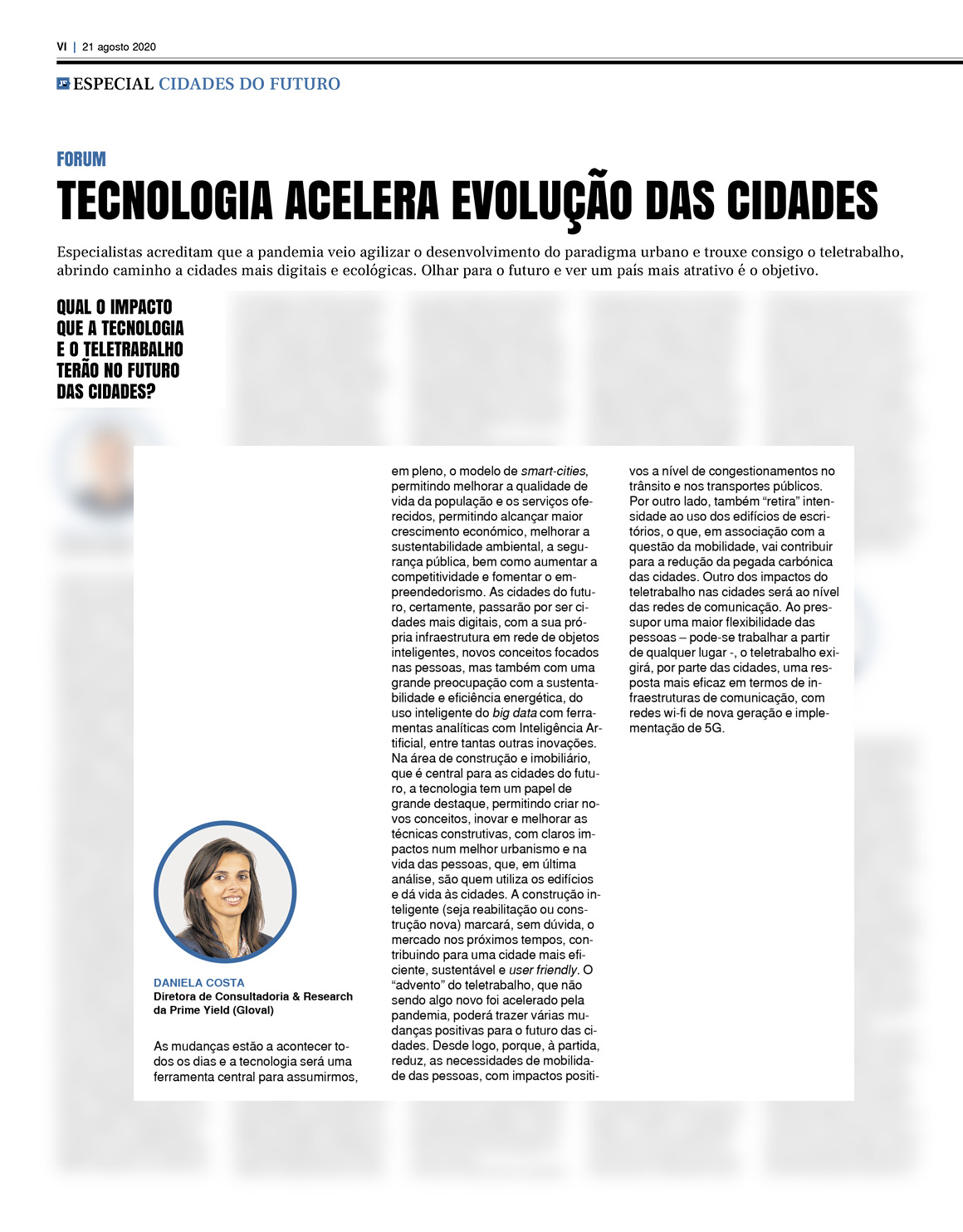 Daniela Costa, Diretora de Consultadoria & Research da Prime Yield, parte da Gloval, foi uma das vozes ouvidas no especial “Cidades do Futuro” do Jornal Económico. O impacto da tecnologia e do teletrabalho no futuro das cidades foi a reflexão lançada pelo jornal, com Daniela a realçar a incontornável importância das soluções tecnológicas para assumirmos em pleno o modelo de smart-cities e contributo do setor imobiliário para estas novas cidades.